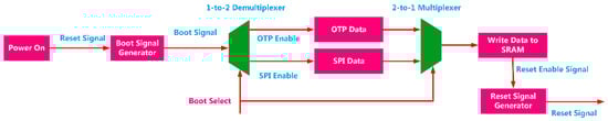 The working principle of the bootloader module is shown in Figure 7. After the power is turned on, a boot signal is generated by the reset signal. When the boot signal is effective, the reset signal is masked, and the enable signals of the OTP wrapper module and the SPI wrapper module are assigned according to the boot selection signal. The selection signal of the boot mode is 1 bit of external input and then the data in the memory is read out and written into SRAM. The data reading process of OTP and FLAH is continuously providing the address and obtaining the data according to the timing requirements. After the SRAM writing is completed, the boot signal fails and a reset signal is generated to reset other modules in the system.