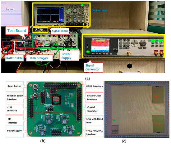 The designed chips and test equipment. (a) Performance test equipment and test site; (b) printed circuit board (PCB) for chip performance test; (c) die picture of the SoC.