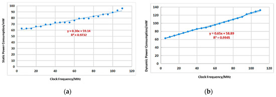 Power consumption vs. clock frequency. (a) Static power consumption vs. clock frequency; (b) dynamic power consumption vs. clock frequency.