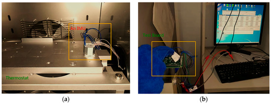 Equipment for the application experiment. (a) One IMU in the thermostat; (b) acquisition test board and the laptop for data processing.