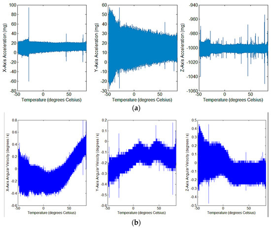 Relation curve between zero deviation of the IMU output signal and temperature. (a) Output of triaxial acceleration; (b) output of triaxial angular velocity.