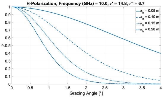 For flat soil (clay) with a moisture content of , we may use (for the horizontal polarization of the SRT) values of and (valid at [20]) as a good approximation of the data. Including the contribution of the land roughness (), Figure 2 shows the amplitude, , of the reflection coefficient for . For low grazing angles (in the order of or degrees), this coefficient is within .