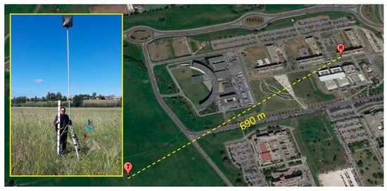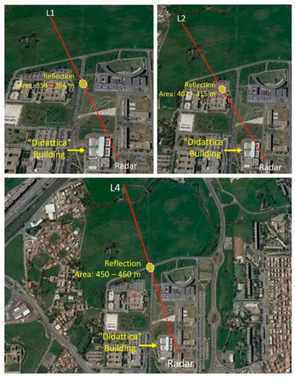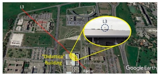 In the frame of the 2018 experiments at Tor Vergata campus and their 2019 follow-on, fixed identical and very large lampposts ( high, here referred to as L1, L2, L3, and L4) at different distances from the radar (, , , and , respectively) were considered as opportunity targets. Figure 9 displays an overview of the area, showing the position of the radar and of the lampposts.