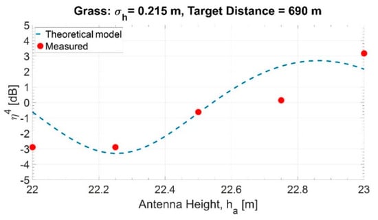 For the five positions, the mean grazing angle is . Using Equation (1) with and , the received power has been evaluated. Hence, the multipath factor has been estimated using the average of the five received power values for each position. Using Equation (5), the amplitude of the reflection coefficient results in . This value is compatible with vegetated land, with the height of the vegetation in the order of 10 to 15 cm, which is consistent with the observed height of the grass on the meadow. Figure 5 shows the theoretical multipath factor and the measured one.