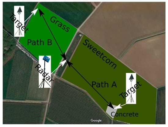 Dedicated experiments were conducted to characterize the effect of different kinds of vegetation on the multipath. Figure 6 shows the setup of the experiments with two positions of the same reference radar target. FHR-NR was installed inside a shelter at a small facility in Wachtberg, surrounded by fields. On one side of the shelter, there was a field of sweetcorn, with an approximate height of . On the other side, there was grassland of approximately in height. The first position of the standard target was located in the sweetcorn field on a block of concrete at a distance to the radar (path A). The second target position had a radar distance of , and was located close to the end of the grass field (path B).