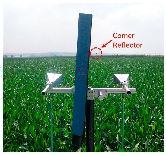On 16 May 2019, a trihedral CR with an of has been posed (as a target) on a tripod at a distance of from the radar (see Figure 4). The weather conditions were cloudy sky with sunshine, , and no wind.