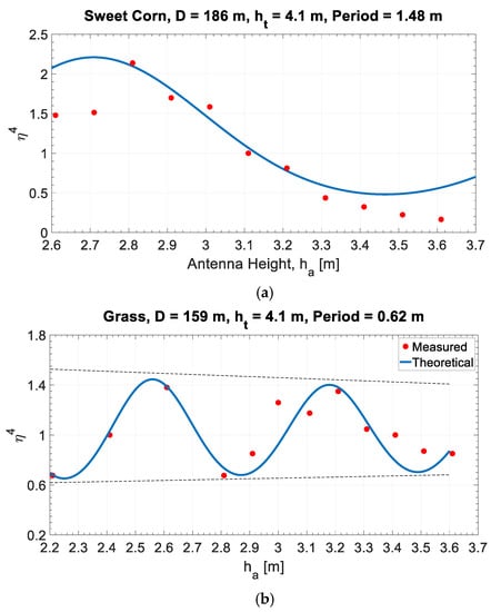 In both graphs of Figure 8 the periodic multipath effect is clearly seen. The measured values (red dots) are in good agreement with the theoretical values drawn as a blue line. The influence on multipath of the different kinds of vegetation can be easily read from the graphs. The amplitude of the oscillation is higher in the case of propagation over sweetcorn while an oscillation with lower amplitude but higher frequency is observed over grassland.