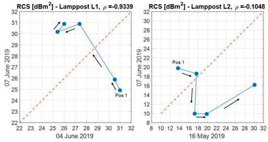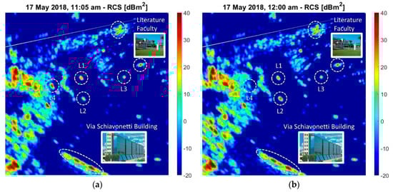 Unexpectedly, during the trials on 17 May 2018, the estimated values of the , in two close times of this day (11:05 and 12:00) have shown a considerable difference for lampposts L2 and L4. For L2, the measured RCS changed from to , while for L4, it changed from to (see Figure 10a,b, where the in is shown as a false color in an area including the four lampposts).