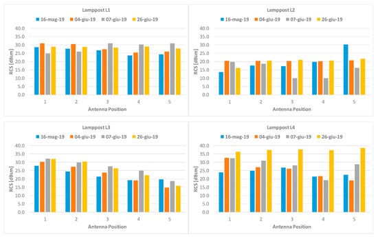 We collected the measurements obtained over the following four different days: 16 May 2019, 4 June 2019, 7 June 2019, and 26 June 2019. Figure 13 shows the measured (in dB square meter) of these four lampposts, with a varying antenna elevation (five steps, 0.25 m each).
