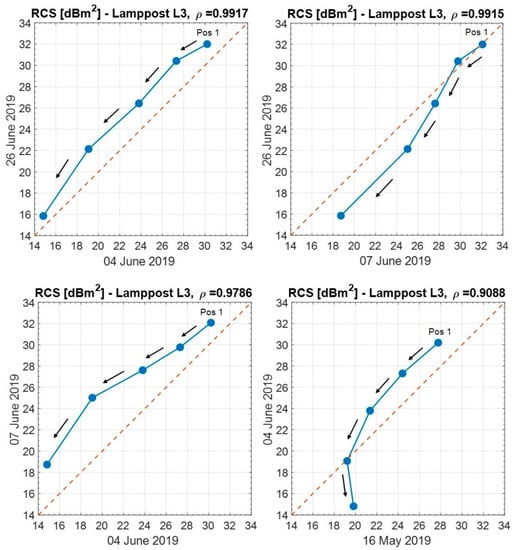 The measurement of the RCS of lamppost L3 does vary a little from day to day, making the correlation coefficient of the measured on two different days close to the unit (Figure 14).