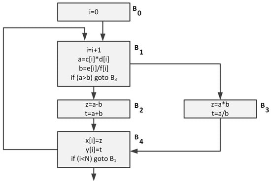 The need to develop new instruction set architectures (ISAs), modify existing ones, as well as create ISA extensions, results from the need to perform a certain group of tasks more quickly and without limiting the flexibility gained through the programmability. Although, for a long time, the task of identifying the potential candidates for new instructions rested with the system designers, in recent years, a number of methods for the automatic generation of instruction set extensions have been developed. They most commonly use compilers to transform an application written in a high-level language, such as C/C++, into the intermediate representation (IR) form, independent of the target processor’s ISA. The most common representation of the IR form is the control flow graph (CFG) []. Figure 1 shows the CFG of a sample application. Each node of the CFG graph represents the basic block of the application, while the edges represent the flow of control between the blocks.