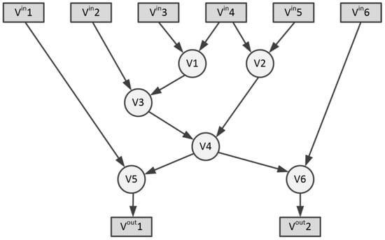 The basic blocks are sets of successive basic operations (such as addition, subtraction, multiplication, shifting, etc.) that do not contain the dependencies regarding the control flow. The individual basic blocks can be represented as acyclic directed graphs (DAG)—, in which the vertices (denoted as ) represent basic operations, while the edges (denoted as ) are data relations between them (see Figure 2). The vertices are basic block inputs, while the edges join the input data with the operations. Vertices denoted as represent outputs from the basic block. The task of the new instruction template is to unify a number of basic operations within a single functional block. The potential candidate for the new instruction is graph , i.e., a sub-graph of the DAG graph G. vertices represent the basic operations contained in the new instruction template, while the edges are the data relationships between them. The vertices are the inputs of the basic block. They may be the vertices of the G graph, or they may result from basic operations not included in the T template: .
