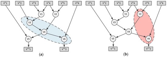 Graph convexity is an important concept in instruction set generation theory. The template T is convex if there is no path in graph G from node to node running through node . The convexity of the graph T ensures that the graph G’ created after replacing the G template with a new custom operation (see Figure 3a) is acyclic. This is a condition that allows the basic block to be executed in the processor. Figure 3b shows the attempt to include V2 and V6 nodes into a new instruction template. This would cause the mutual dependence of unified nodes V2 and V6 on node V4, making the entire operation not feasible in the sequential execution of operations.