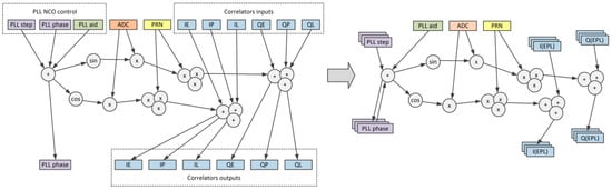 In the second step, similar to the previous one, all the operations that violate the relation should be identified. The condition of functional universality is met by all the operations identified as sub-sequences in the previous step. The CFG graph of a GNSS receiver should include a frequency-locked loop—FLL, PLL/DLL discriminators and filters, as well as code generators, as separate basic blocks and prevent them from merging. This will ensure receiver implementation flexibility in terms of tracking loop architecture, filter structure, and external aiding.