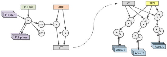 Figure 4 presents the process of identifying the variables that can be realized in form of custom register file windows. A DAG graph of the high-speed part of the GNSS tracking loop CFG contains carrier removal, spreading sequence removal, and data accumulation in in-phase (I) and quadrature (Q) early (IE, QE), and prompt (IP, QP) and late (IL, QL) branches. As many as eleven inputs contain the analog-to-digital converter’s sample (ADC), spreading sequence data (pseudo random noise, PRN), accumulator data (IE, IP, IL, QE, QP, QL), and PLL control inputs (current PLL phase and step). Seven outputs provide new correlators and PLL data. On the other hand, the DAG body contains only a few node layers. Using the traditional method of instruction set generation would result in many relatively simple instructions that would have questionable performance. One must remember that the new instruction template should replace a portion of the DAG that is big enough for its performance improvement to overcome the overhead of adding this template to the base processor ISA. After identifying the nodes that have local character and can be arranged in custom multi-channel register windows, the DAG graph was reduced to only three inputs and one output. Such a DAG graph can be easily divided into two new instructions—gnss.carr.rem for carrier removal and gnss.accu.add for code removal and accumulation (see Figure 5). For clarity, the gnss.accu.add instruction presented in Figure 5 has only three correlation branches—early (E), prompt (P), and late (L). The actual number of branches is implementation-dependent and can be five or even higher. The additional correlation branches can be used with methods like bump-jumping [], and more sophisticated tracking algorithms like ASPeCT [] or the TM61 [] method for tracking the binary offset carrier (BOC) or time-multiplexed BOC (TMBOC) signals.
