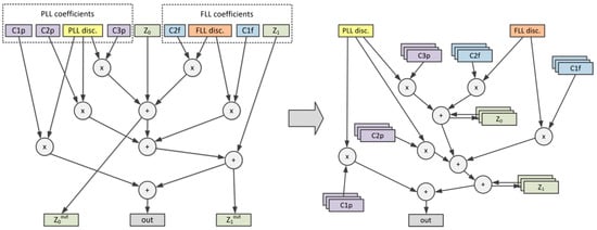 Another example of using custom register file windows concerns the filter used for the phase-locked loop (PLL), frequency-locked loop (FLL), or delay-locked loop (DLL). Figure 6 presents a DAG representation of a third-order PLL filter with second-order FLL aiding from []. Nodes Z0 and Z1 present the two internal filter states that serve as inputs and outputs to be stored after the new filter value calculation. After the identification of local variables, the DAG graph can be reduced to have only two inputs and one output. This easily fits a single instruction template—gnss.pll.flt.