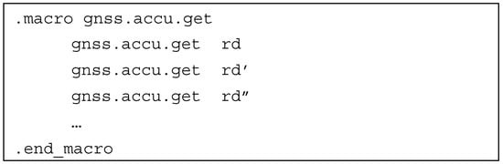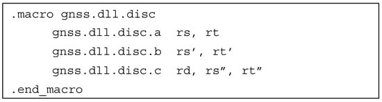 Similar to the carrier discriminator, the code discriminator is implementation-dependent. In the literature, one can find a large number of DLL discriminator architectures, starting from the simple coherent , through high-performance non-coherent , to sophisticated discriminators utilizing many correlation branches []. Therefore, the authors would like to introduce a single instruction to perform the code discriminator function—gnss.dll.disc. As can be seen, the number of input parameters used can vary from two to six and more. This can be achieved by defining gnss.dll.disc as a macro-instruction, as presented in Figure 7. This approach is similar to the one used by the MULScc instruction in SPARC V8 (Scalable Processor ARChitecture) architecture [].