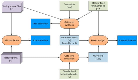 This section presents the synthesis results of the GNSS navigation system containing four core processor (classic six-stage pipeline RISC architecture) and GNSS tracking channels in total number starting from zero to forty-eight. For this purpose, the whole GNSS navigation system incorporating a wide range of peripherals and 512 KiB of embedded memory was configured and synthesized for 100 MHz with the CMOS (complementary metal-oxide semiconductor) 130 nm process []. Figure 9 shows the used flow to obtain particular results. The tracking loop algorithms execution time is derived from the RTL (register-transfer-level) simulation. Gate-level synthesis of the GNSS navigation system with a different number of tracking channels was used to obtain the area estimation. Finally, gate-level simulation of the tracking loop algorithms enabled power consumption estimation.