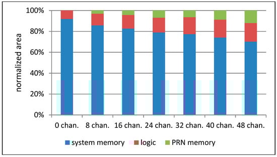 Normalized standard cells’ area as a function of GNSS tracking channels.