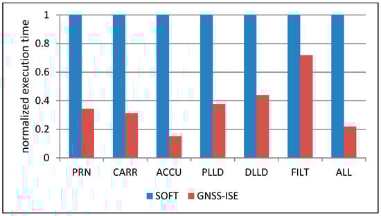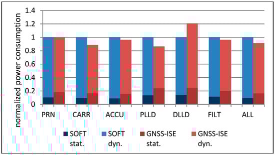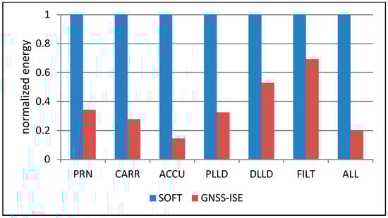 Figure 10 shows that with the growing number of tracking channels, the cells’ area grows linearly, but the most area-consuming part of the navigation system is still the large amount of embedded RAM memories. Figure 11 presents the comparison of the normalized execution time of particular tracking loop parts and the whole tracking loop. The executed algorithms include the spreading sequence generation (PRN), carrier removal (CARR), spreading sequence removal and accumulation (ACCU), PLL discriminator (PLLD), DLL discriminator (DLL), and loop filter (FILT), as well as a complete tracking loop (ALL). What could be expected is that the hardware implementation of particular GNSS tasks resulted in a significant execution time reduction. Please note that many of the GNSS-ISE aspects are implementation-dependent and the presented example shows only one of the possible implementations. The obtained results can differ among other implementations while the execution time reduction should still be observed. Figure 12 shows the normalized power consumption during execution of particular tracking loop parts and the whole tracking loop. What can be seen is that the power consumption changed insignificantly. Despite the processor core being relieved from processing GNSS data, the power consumption was caused by the additional hardware that was involved in the tracking loop execution. Figure 13 shows that with the maintained power consumption, but achieving significant time reduction, the energy needed for the execution of particular tracking loop parts and the whole tracking loop was also reduced significantly.
