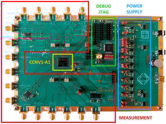 CCNV1-A1 measurement and evaluation board. The PCB (printed circuit board) board contains an CCNV1-A1 integrated circuit (IC) with surrounding radio frequency (RF) test and measurement infrastructure. The power supply is composed of a separate linear regulator for each analog and digital IC part for test purposes.