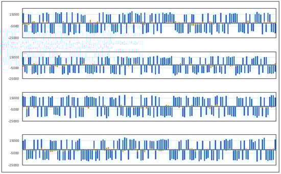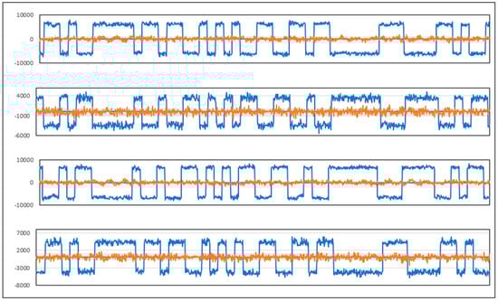 Prompt in-phase (blue) and quadrature (red) tracking results (for 1 s) of GPS C/A (coarse acquisition signal) multi-channel processing of real data using GNSS-ISE (SV12, SV15, SV24, SV32). Tracking is performed with 1 ms integration time, 20 ms per GPS C/A.