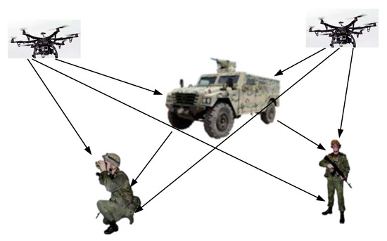 The cooperative operation among manned and unmanned platforms is becoming increasingly demanding with the development of navigation, communication, and intelligent control technologies, etc. Most robotic platforms or even human are equipped with navigation devices such as Global Navigation Satellite System (GNSS) and inertial measurement unit (IMU) [1]. However, positioning tasks become difficult in the face of IMU error accumulation, signal occlusion, and environmental interference (smoke, buildings, forests, canyons, etc.). The concept of joint localization begins to gain in popularity [2,3]. Unlike positioning platforms with a single node, cooperative localization fully exploits positioning information exchanged in a multi-node ad hoc network. Not only can it lead to more accurate estimates for the position of the target node, but also expand the coverage and enhance the overall stability of the network [4]. Figure 1 illustrates an application scenario in which soldiers and unmanned vehicles are accurately localized under a collaborative network.