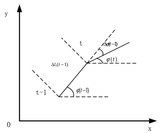 In this paper, we assume that the target node has basic relative dead reckoning capability. The navigation device needs to provide real-time information and displacement increment . As shown in Figure 3, this information is used to estimate the current coordinates of the carrier by DR model [24]. At time (t − 1), the current position is . If the next step is to move a distance of with an azimuth angle of to the position of time (t), the coordinates of time (t) can be calculated by Equation (3) [25].