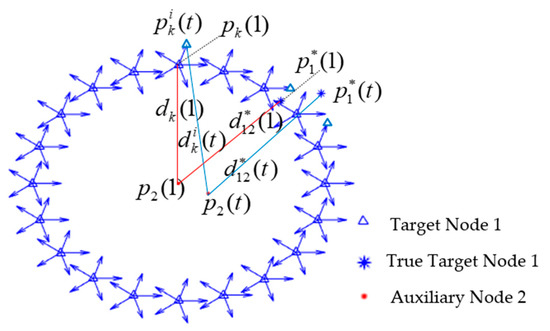 Let be the measured true distance between true target node 1 and auxiliary node 2 at (t) time. The predicted distance between and auxiliary node 2 is denoted as . denotes the difference between the predicted distance and the measured distance of each particle, which is used in the calculation of particle weight. The particle with predicted distance that best matches the measured distance gets the highest weight. Through PF, the particles swarm will gradually converge to the true state. The position of the target node 1 is replaced by the position of cooperative localization to realize the trajectory tracking of the target node 1, and the initial azimuth of the target node 1 is derived from the optimal trajectory.