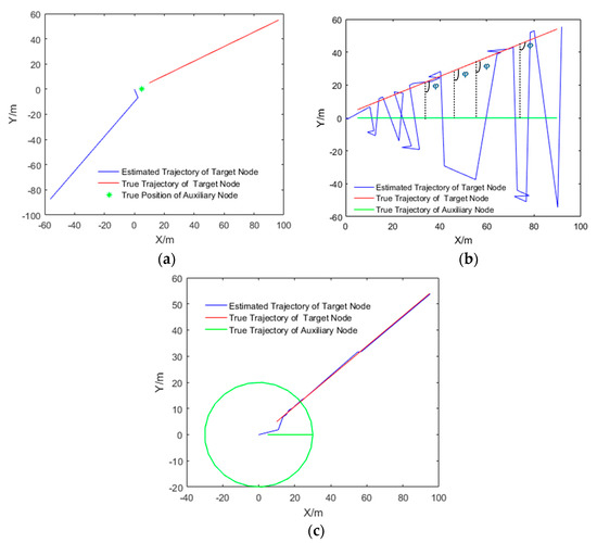 As shown in Table 1, when the auxiliary node is fixed or the range of target node to the auxiliary node located at the same relative direction, there is a singular value of 0, which denotes the system is not observable. When the auxiliary node does not move with respect to the target node, the system is observable for the full rank of observable matrix . Therefore, to make the system observable, in the process of cooperative localization, the PWCS observability analysis method can be used to optimize the appropriate auxiliary node trajectory.