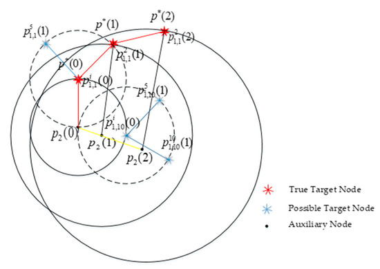 According to PF algorithm and DR model, if auxiliary node 2 is moving, the particles propagation of the AACOPF algorithm is shown in Figure 6. () are the possible positions of target node 1. are the true position of target node 1, and denotes the position of moving auxiliary node 2. At time (0), particles are generated, and each particle is given m directions, after particles propagate by DR model, we can get particles at time (1). The red line denotes the true trajectory of target node 1, the blue line is the estimated trajectory, and the yellow line denoted the true trajectory of auxiliary node 2. According to the proof of cooperative positioning algorithm, only when node 2 is in motion, the error converges, thus, the coordinates of the target node 1 can be estimated.