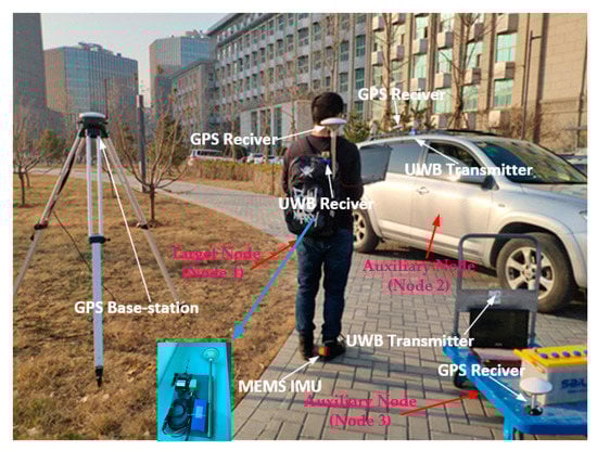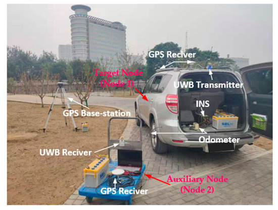 - The car equipped with IMU, odometer, GPS, and UWB ranging module functions as the target node (node 1). The trolley functions as auxiliary node (node 2), which is equipped with GPS that can provide accurate position information as well as UWB ranging module. The positioning accuracy of GPS is 5 cm, and the Gyro bias less than 0.05°/h.