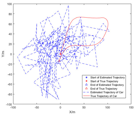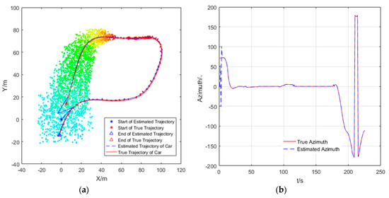 In the experiment, the true initial azimuth of car is . In Figure 8, it can be seen that when the trolley is stationary, the estimation trajectory of car cannot track the true trajectory, and the estimation of initial azimuth is very different from the true initial azimuth , the cooperative localization algorithm could neither track the trajectory of the car, nor can it estimate the azimuth when the trolley is stationary. However, in Figure 9, when the trolley is moving, the estimated trajectory and azimuth of the car is convergent, and the convergence process of particles at different times is represented by different colors. In Figure 10, it can be seen that the cooperative localization algorithm can track the trajectory of the car with high accuracy of up to 0.3 m. the initial azimuth calculated by the algorithm and the estimated the azimuth error converges and the accuracy of azimuth estimation reaches 0.0539°.