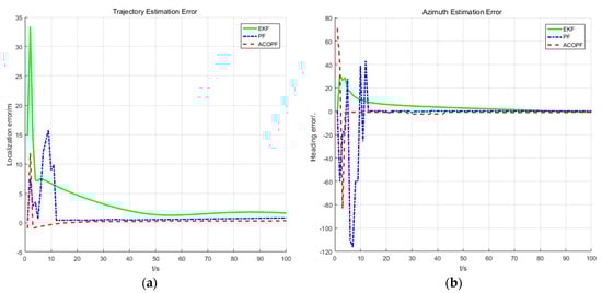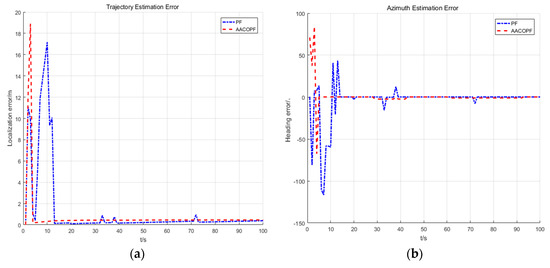 The trajectory estimation errors (a) and azimuth estimation errors (b) of the pedestrian (target node 1) for one of the running programs, when N = 400, M = 400.