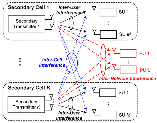 We consider an underlay CR network, as shown in Figure 1, which consists of a primary network and multiple secondary cells. The primary network serves L PUs indexed by l L = { 1 , , L } . The secondary network consists of K cells. In each secondary cell, an ST with N t antennas serves M SUs with the inter-network interference constraint to PUs. Let the kth secondary cell be indexed by k, where k K = { 1 , , K } , and the set of served SUs in the kth cell be denoted by M k , where the cardinality is | M k | = M . The intersection of all served SUs’ sets is an empty set, i.e., k K M k = .