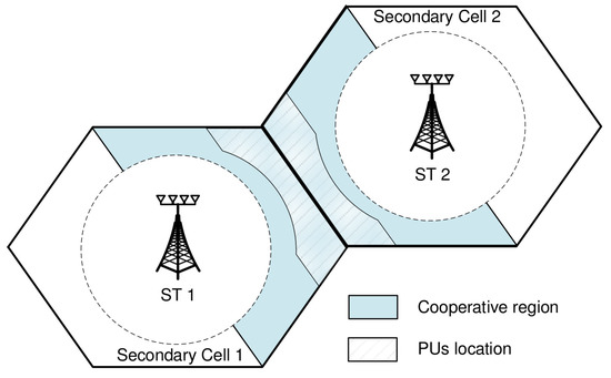 An underlay CR network with L = 2 , M = 2 , K = 2 , and N t = 6 is considered. For all scenarios, P max is set as P max / σ m 2 = 0 dB for m , and the average inter-network interference constraint is I t h = 0 dB. Additionally, we assume that the path loss coefficient is 3.8 and the standard deviation for large-scale shadowing is σ S = 8 dB. We uniformly distributed the location of SUs according to the coordination area of [23]. As shown in Figure 2, all SUs lie in the region 0.325 d k , m 0.5 , where d k , m is the normalized distance from ST k to SU m. Meanwhile, all PUs are distributed in the region 0.35 d k , l 0.65 , where d k , l is the normalized distance from ST k to PU l. The numerical results are obtained by taking an average of 50,000 drop events of PUs and SUs. Here, the drop event means a simulation event that SUs randomly drop in the region 0.325 d k , m 0.5 and PUs randomly drop in the region 0.35 d k , l 0.65 ; and we ran N s i m = 50,000 simulations.
