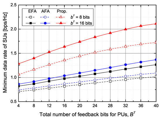 First, from Figure 3, Figure 4, Figure 5 and Figure 6, we evaluate the performance of the feedback bits allocation scheme proposed in Section 4.3, in terms of maximizing the minimum SINR among SUs. Figure 3 shows the supported minimum data rate of SUs according to the number of feedback bits for PUs and SUs under the average inter-network interference constraint at PUs. As the number of feedback bits for PUs, B T , increases, the ST can increase the transmit power while satisfying the interference constraint. Hence, the minimum data rate of SUs increases with the increase of B T . The proposed scheme outperforms the conventional EFA and AFA schemes. In particular, when B T = 20 bits and b T = 8 bits, the proposed scheme increases the minimum data rate of SUs by about 69.5 % and 59.1 % , respectively, in comparison with the EFA and AFA schemes. Although the AFA scheme adaptively allocates the feedback bits to SUs, it slightly increases the minimum data rate of SUs compared with the EFA scheme because the conventional AFA scheme does not adaptively allocate the feedback bits to PUs.