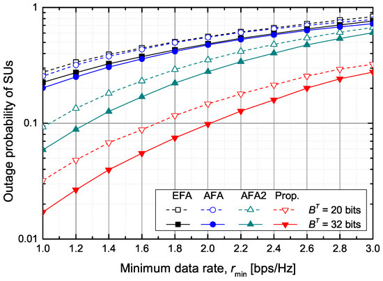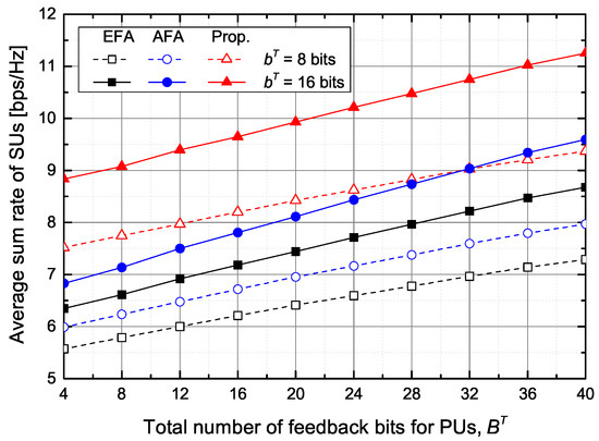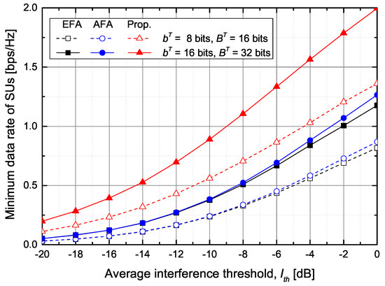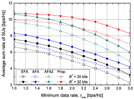 Figure 9 shows the average sum rate of SUs according to the required minimum data rate of SUs when I t h = 0 dB and b T = 16 bits. The proposed scheme outperforms the other schemes, the EFA, AFA, and AFA2 schemes. When r min = 2 bps/Hz and B T = 32 bits, the proposed scheme increases the achievable average sum rate of SUs by about 71.2 % , 54.0 % , and 10.9 % , respectively, in comparison with the EFA, AFA, and AFA2 schemes.