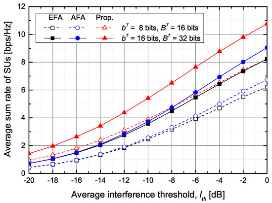 Figure 6 shows the average sum rate of SUs according to the average inter-network interference threshold. The proposed scheme shows that the average sum rate of SUs is higher than that of the conventional schemes. For example, when B T = 32 bits and b T = 16 bits, the proposed scheme improves the average sum rate of SUs by about 45.0 % and 37.5 % , respectively, in comparison with the EFA and AFA schemes.