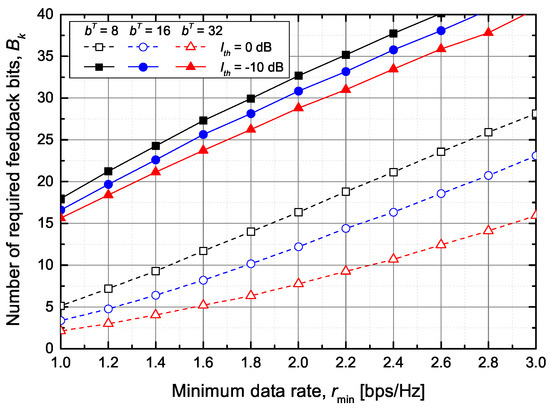 Although the feedback bits allocation scheme proposed in Section 4.3 increases the minimum data rate of the SUs, it may not guarantee the minimum data rate of SUs because of the limited number of feedback bits. Hence, we need to determine if the number of feedback bits is sufficient to meet the minimum data rate constraint of SUs, by using (28) which is the scaling law of the number of feedback bits.