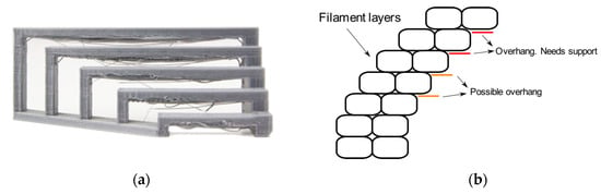 In the standard FDM 3D printing process, the 3D object is built by means of layering melted plastic threads that are extruded following a predetermined path. Each layer is deposited with an offset (which can be constant as well as variable) from the previous. Since gravity inevitably acts on the hot extruded plastic, each deposited strand, in order to maintain the supposed shape, needs to be able to solidify without drooping or deforming. This is why one of the main limitations of the FDM 3D printing process (but also of other processes like stereolithography (SLA)) can be identified in the capability of printing all these structures where a section of the n-th layer is not supported by the (n − 1)-th layer. These shapes are called overhangs and bridges (Figure 2a,b, respectively). Overhangs are typically negligible if the angle formed with the printing Z axis is less than 50° (see Figure 3). For any steeper angle, geometrical inaccuracy occurs if proper precautions are not taken.