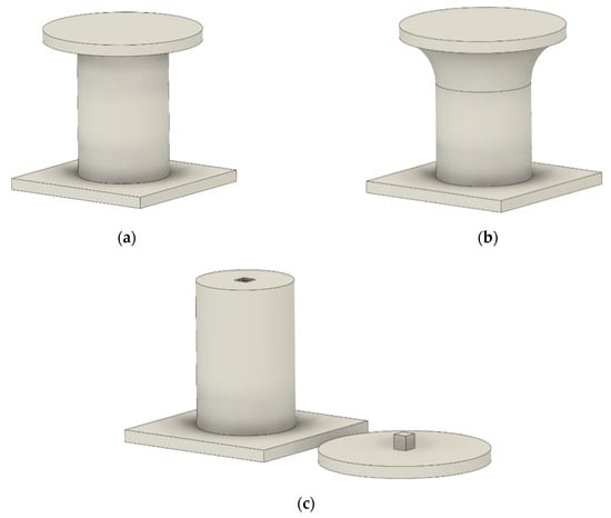 Test samples were measured with a digital micrometer (±3 µm accuracy). For each sample, measurements were taken at different points of the surfaces, and the mean value was extracted. The mean value across the 10 samples was evaluated and reported in Table 1. Measured dimensions a–c are highlighted in the CAD models of Figure 9.