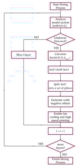 To better understand we outline the working principle of the proposed method, the slicing algorithm flow of operation. The flowchart of the method is given in Figure 5. When, during any slicing procedure, an undercut is detected at height , the following algorithm takes place, substituting the standard one: