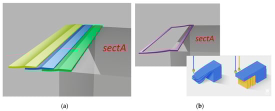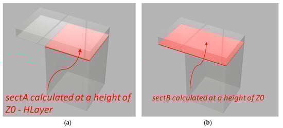 - Calculate the surface of the plane that aws printed just before the undercut at height , where is the deposition thickness of each layer (or at least the deposition thickness of the previous layer). This surface is named sectA (Figure 6a).