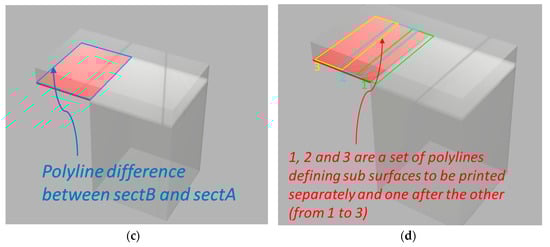 - Generate a set of polylines that cover all overhang area , and obtain the list of polylines (listOffsetSezA). The offsets from sectA for each polyline are generated for steps smaller than the extruded filament width until it reaches the external boundary of sectC. The computed offsets are such that each extruded polyline inevitably superimposes the previous one for a very small fraction of a millimeter (Figure 6d). In other words, each polyline is both part of the model and acts as a supporting structure for the next one.