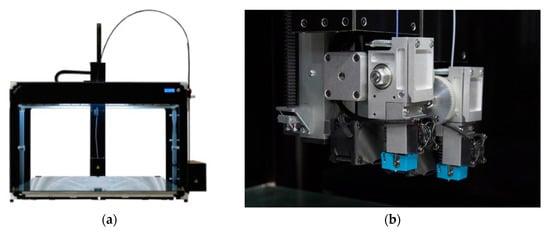(a) Testing 3DPRN LAB H5 FDM printer; (b) dual-extrusion setup utilized for test.