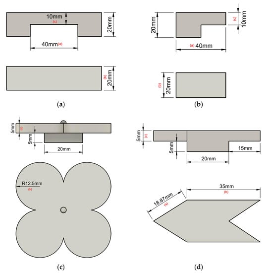 For analysis, four different specimens were considered, each with a different form factor, to validate the proposed algorithm in different scenarios. Three of them were a 90° overhang (with a circular, triangular, and rectangular floating surface; see Figure 9b–d), while the last one was a bridge (see Figure 9a). CAD (computer aided design) dimensions of the samples are reported in Figure 9.