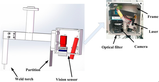 Robotic welding technology is an important indicator on which to measure the technical development of the welding industry in today’s highly developed environment. Currently, the two most common operating modes for welding robots, namely, the teaching mode and the off-line programming mode, do not depend on sensor measurements during welding; the welding trajectories are set in advance by workers, and the robot moves in accordance with the desired trajectory. These two modes are suitable for use in a standardized, modular, strictly coordinated welding system [1,2,3,4]. However, in actual welding operations, the welding environment might not be static. Therefore, these two modes do not offer sufficient flexibility and robustness to handle such a complex and dynamic welding environment. The teaching mode and off-line programming mode require a lot of time to teach and preprogram each time the workpiece is replaced; therefore, with the rapid improvement in sensor technology and integration technology, intelligent welding robots that can overcome the difficulties that are encountered when operating welding robots in the teaching and off-line programming modes are emerging. An intelligent welding robot uses external sensors to perceive its environment and detect the weld position. In the past, arc and contact sensors were two of the most widely applied types of sensors in robot sensing models [5,6]. Visual sensing is widely used presently in the field of robotic welding because of its high accuracy and non-contact nature [7,8,9]. Furthermore, it could obtain abundant information regarding the welding environment. Currently, most visual sensors are composed of a camera, an auxiliary laser, a filter, and a partition. In general, the auxiliary laser is a line laser. Research that is related to visual sensors typically focuses on image preprocessing [10,11,12], weld joint contour extraction [13,14,15], and weld feature point extraction [16,17,18].