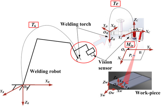 OWXWYWZW is world coordinate system, OIXIYI is pixel coordinate system, OCXCYCZC is camera coordinate system, OHXHYHZH is robot welding torch coordinate system, ORXRYRZR is robot base coordinate system. OBXBYBZB is workpiece coordinate system, Te is hand-eye matrix relating OCXCYCZC to OHXHYHZH, as obtained by hand-eye calibration [24], T6 is transformation matrix between OHXHYHZH and ORXRYRZR, as obtained by the robot controller, Min is the transformation matrix between OCXCYCZC and OIXIYI, obtained via camera calibration [25], Π1 is the imaging plane, P is one of the projection points of the laser on the surface of the welding work-piece, and Pi (XI, YI) is the image point that corresponds to P in the pixel coordinate system. The laser plane can be represented by Ax + By + Cz = 1. It can be calculated by laser plane calibration [26]. Therefore, the 3D camera coordinate of P (XC, YC, ZC) can be represented by Pi, camera intrinsic parameters and laser plane, as follows
