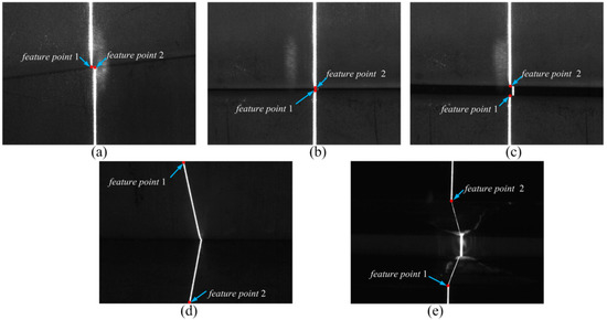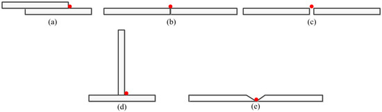 Feature points of weld joints: (a) lap weld joint, (b) butt weld joint, (c) splice weld joint, (d) fillet weld joint, and (e) v-type weld joint.